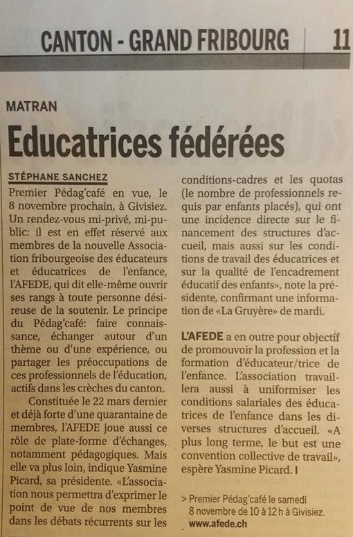 - Suite à la lettre du DSAS concernant les nouvelles directives pour les structures d'acceuil préscolaires, la FCGF, l'AFDRIPE et l'AFEDE ont prit position lors d'une conférence de presse le lundi 2 novembre 2015. Cliquez sur les liens ci-dessous afin d'ouvrir le reportage TV/Radio